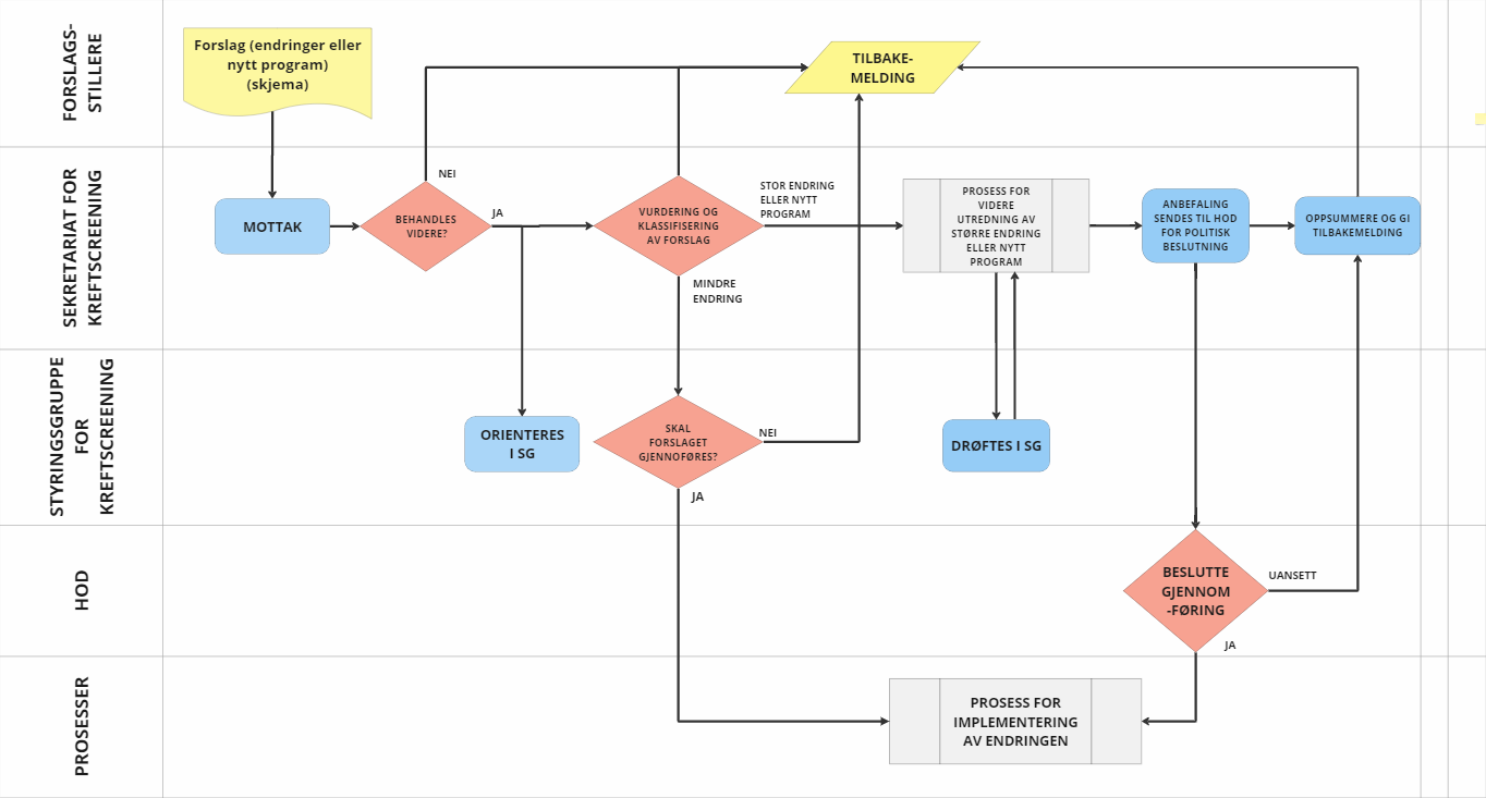 Forslag om nye screeningprogrammer saksbehandles i Helsedirektoratet før politisk beslutning i Helse- og omsorgsdepartementet. Forslag om større endringer i eksisterende program saksbehandles i Helsedirektoratet og i styringsgruppe for nasjonale kreftscreeningprogram før politisk beslutning i Helse- og omsorgsdepartementet. Forslag om mindre endringer i eksisterende programmer, kan etter saksbehandling i Helsedirektoratet besluttes i styringsgruppen.